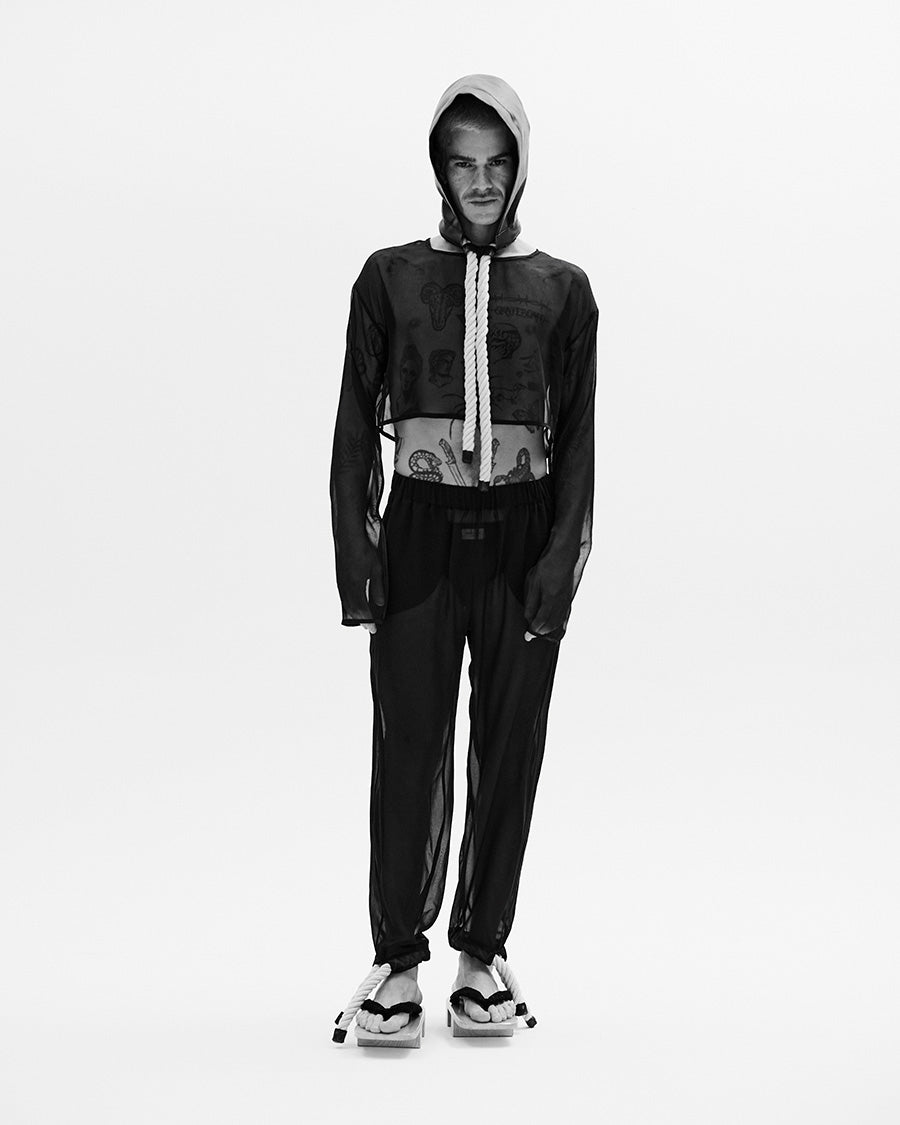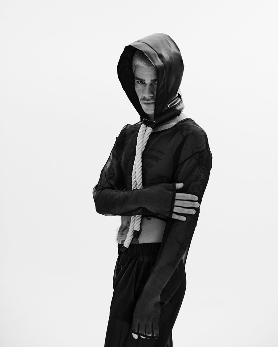 During Guido Vera’s childhood, summers meant leaving the nest to visit his grandparents’ home. The journey was made by car alongside his parents, passing through Argentina and Chile. Along the way, he witnessed a naturalization of death through the oil wells of the Patagonian region and roadkill, inspiring the black tones of these accessories and garments. Logs scattered on the roadside and newly hatched birds were recurring images that stayed with Guido, which is why the fabric textures evoke these memories, with a standout layered craftsmanship.